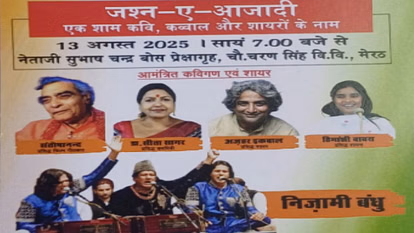 आजादी के जश्न को शब्दों, सुरों और भावनाओं में पिरोने के लिए मेरठ में अमर उजाला के अभिनव अभियान के तहत एक विशेष सांस्कृतिक कार्यक्रम आयोजित किया जा रहा है। ‘मां तुझे प्रणाम-जश्न-ए-आज़ादी’ के तहत 13 अगस्त (बुधवार) की शाम 7 बजे से चौधरी चरण सिंह विश्वविद्यालय के नेताजी सुभाष चंद्र बोस प्रेक्षागृह में कवि, कव्वाल और शायर एक ही मंच पर अपनी प्रस्तुतियां देंगे।